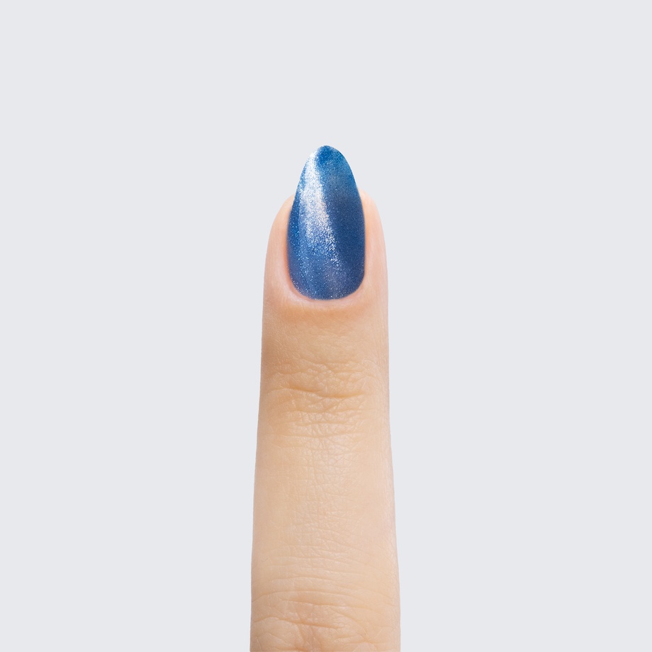 Cobalt blue. Dark. Light blue magnetic shimmer. Opaque. Cool undertone.